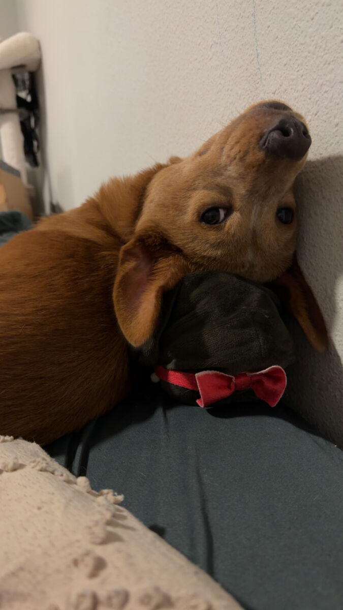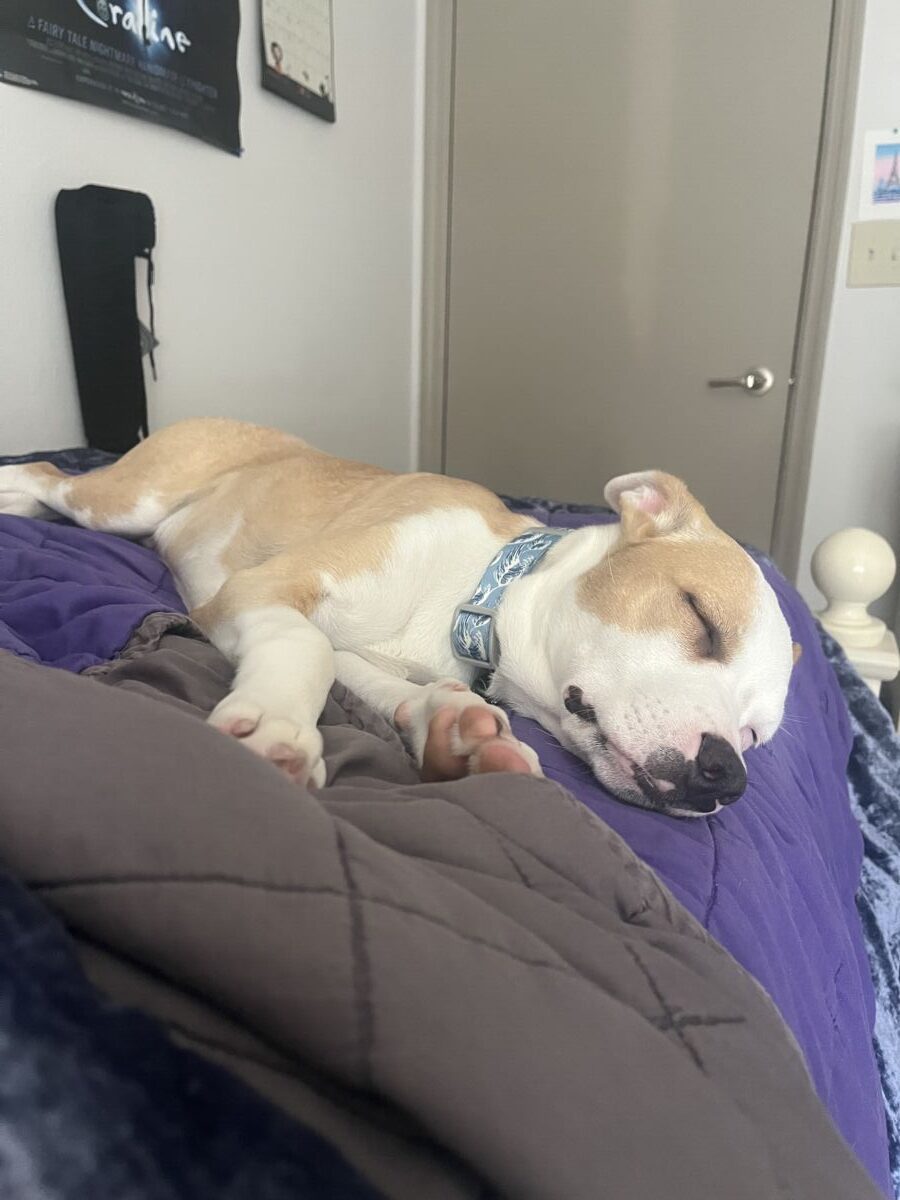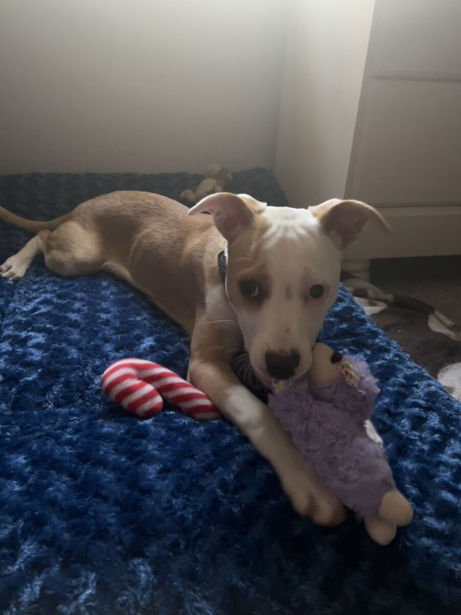 About Me: Oliver is a LOVE BUG!! His tail is always wagging and he is truly the happiest boy. For a 2 year old boy, Oliver is very calm. Inside the house, he is typically cuddled up sleeping, or chomping on a chew toy. Outside, he loves getting the zoomies in our fenced yard. He also walks excellent on a leash, so a fenced yard is not required. He prefers sleeping in a bed with his people, he has slept with my 11yr old son since he was a puppy.