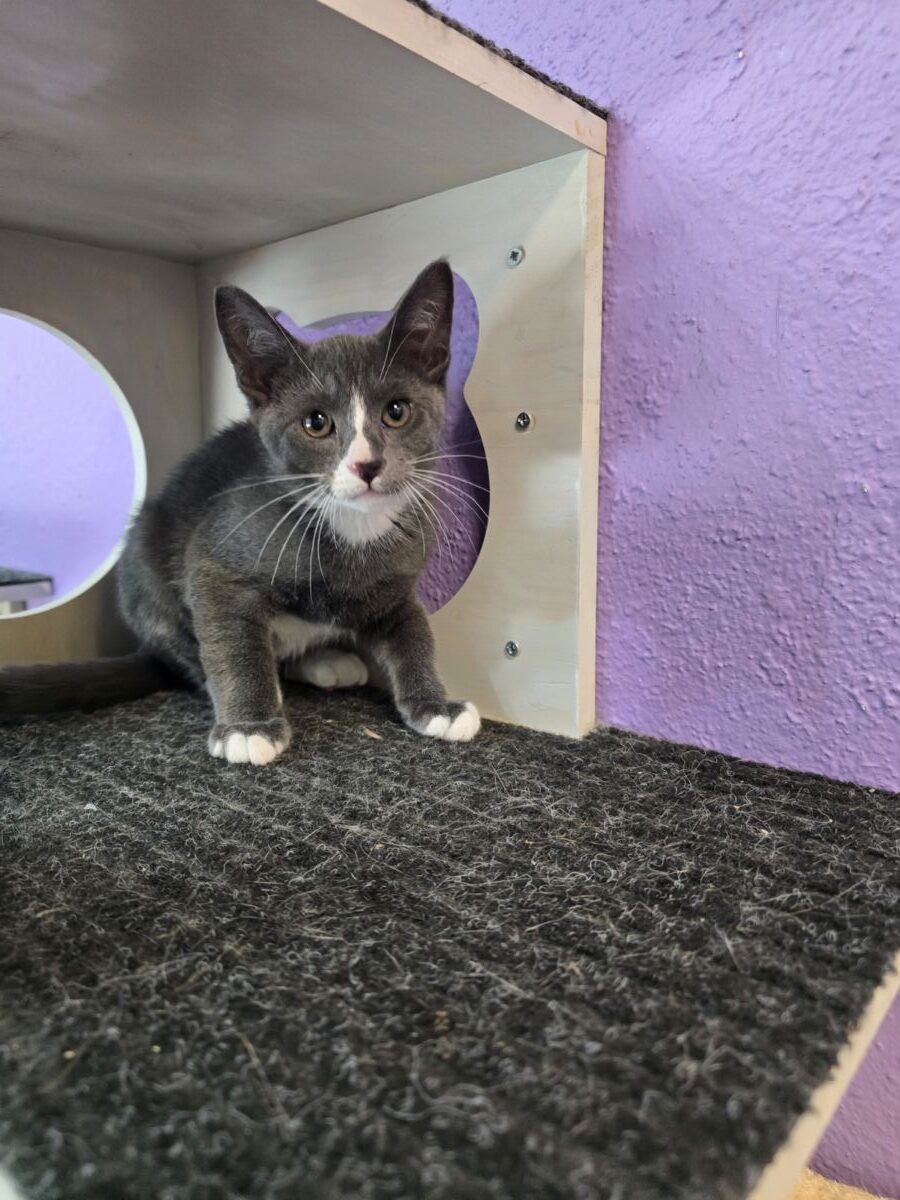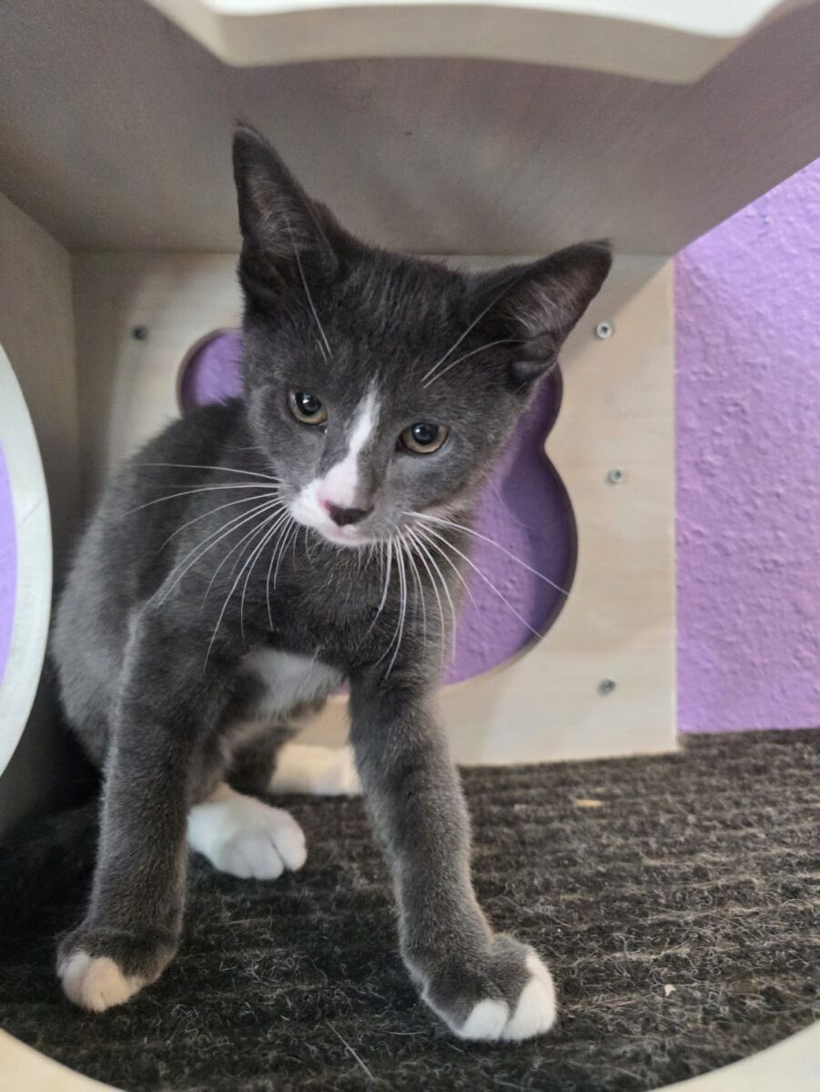 This handsome grey-and-white tuxedo kitten is a total heart-stealer with a flair for friendly mischief. Greyson loves to use his paws—whether he’s reaching out to gently tap your face, kneading with joy, or practicing his best boop. He’s social, sweet, and already showing signs of being a future high-five champ. If you’re looking for a playful companion with a soft touch and a paw-some personality, Greyson’s your guy!