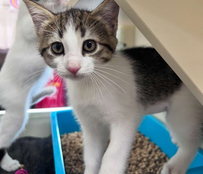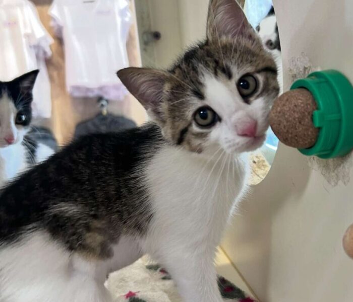 This brown‑and‑white tabby girl is pure curiosity wrapped in soft stripes. If there’s a nook, she’ll explore it. If there’s a toy, she’ll pounce it. If there’s a human nearby, she’ll be right over to supervise with bright eyes and a chirpy little “what’s next?”
