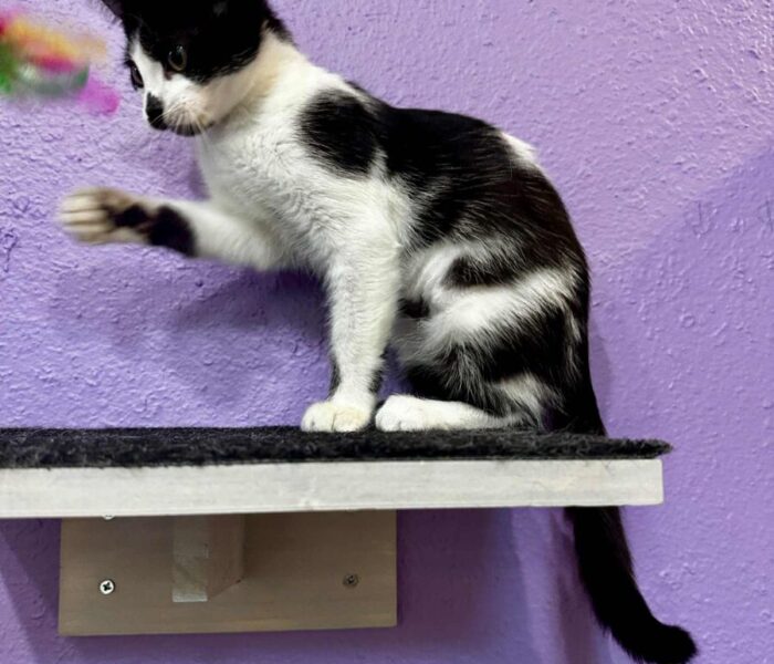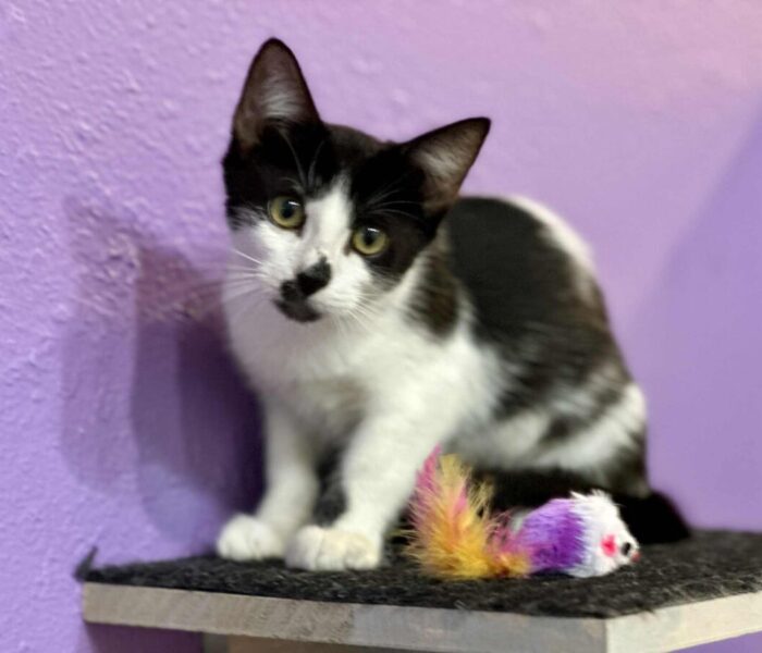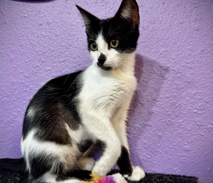 Awww – check out this black & white cutie pie! We love her random little patches of black. She might have some dairy cow DNA in her history – we all know that if they are born on a dairy farm, they resemble the cows there. Or, I just made that up, or did I? At any rate, she’s adorable and clings to you for a nice little snuggle! She’s not a slacker in the play department either. Come on in for a meet & greet.