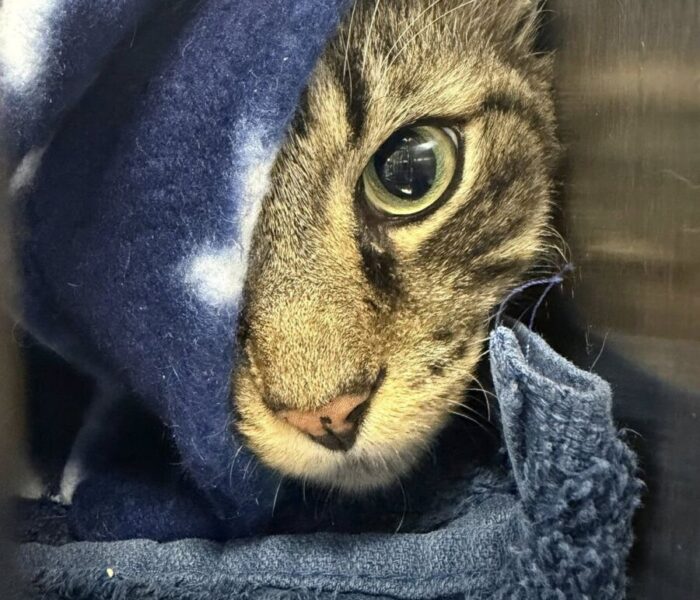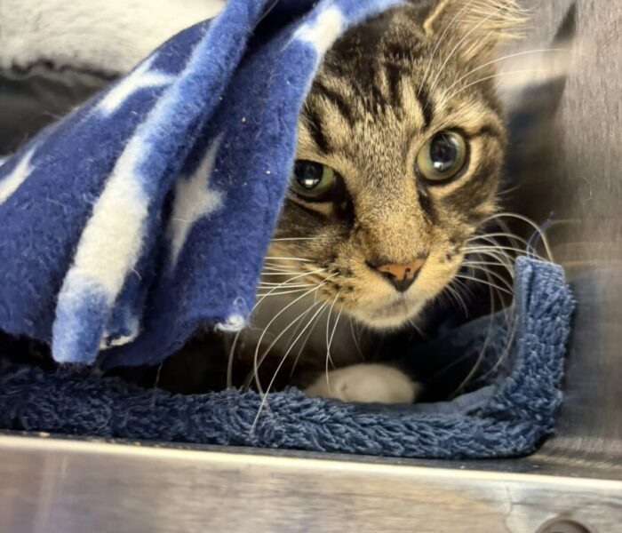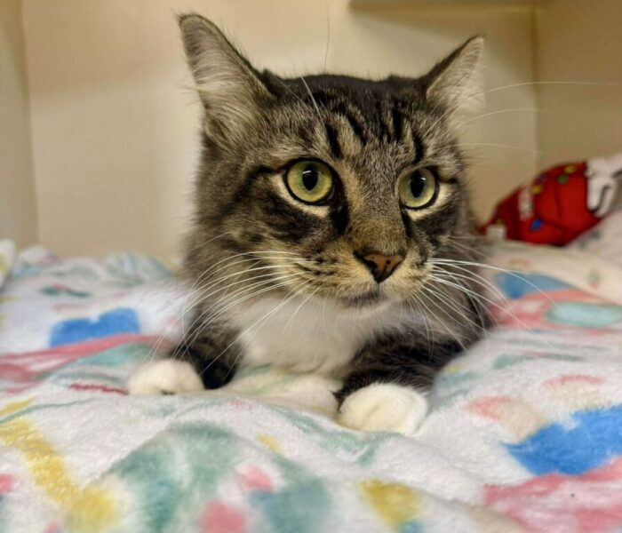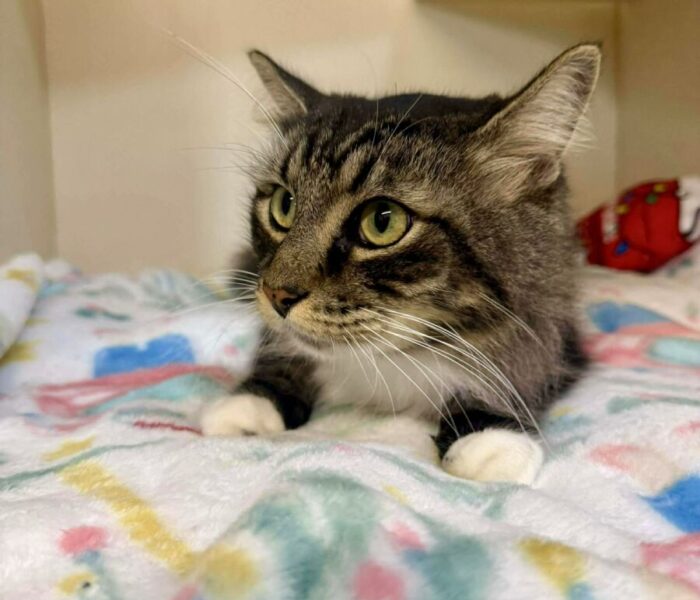 Little Bit is a distinguished gentleman with the sweetest tabby stripes and dapper white chest and boots. At 7 years old, he’s the perfect mix of playful curiosity and cozy companionship.