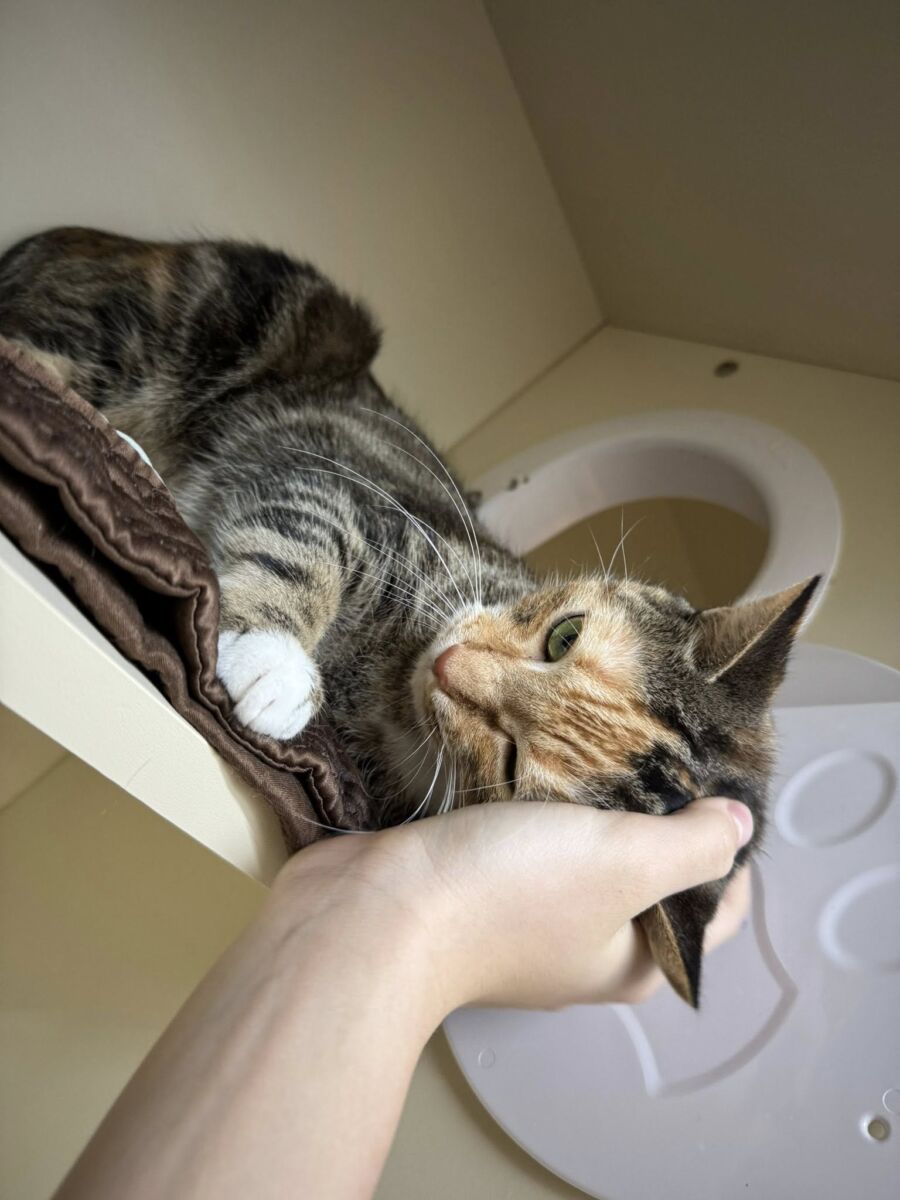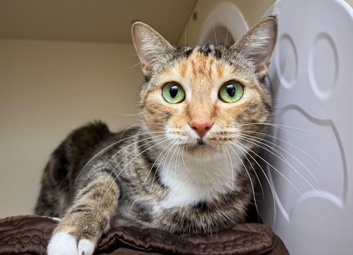 Just three years old and finally catching her breath! This gorgeous calico queen just wrapped up raising four adorable kittens and is now ready for some well-deserved “me time.” May’s idea of bliss? A cozy perch, a quiet room, and chin scritches that make her purr like a motorboat. Once she’s comfy, she’s all in for every kind of scritch—chin, cheeks, ears, you name it. And don’t be fooled by her serene vibe—come dinnertime, she turns into a full-on chatterbox with opinions to share and a meow that means business. May’s gentle, observant, and carries herself with the grace of a cat who’s seen it all—and still believes in love. Come meet her and show her that the best chapter is yet to come.