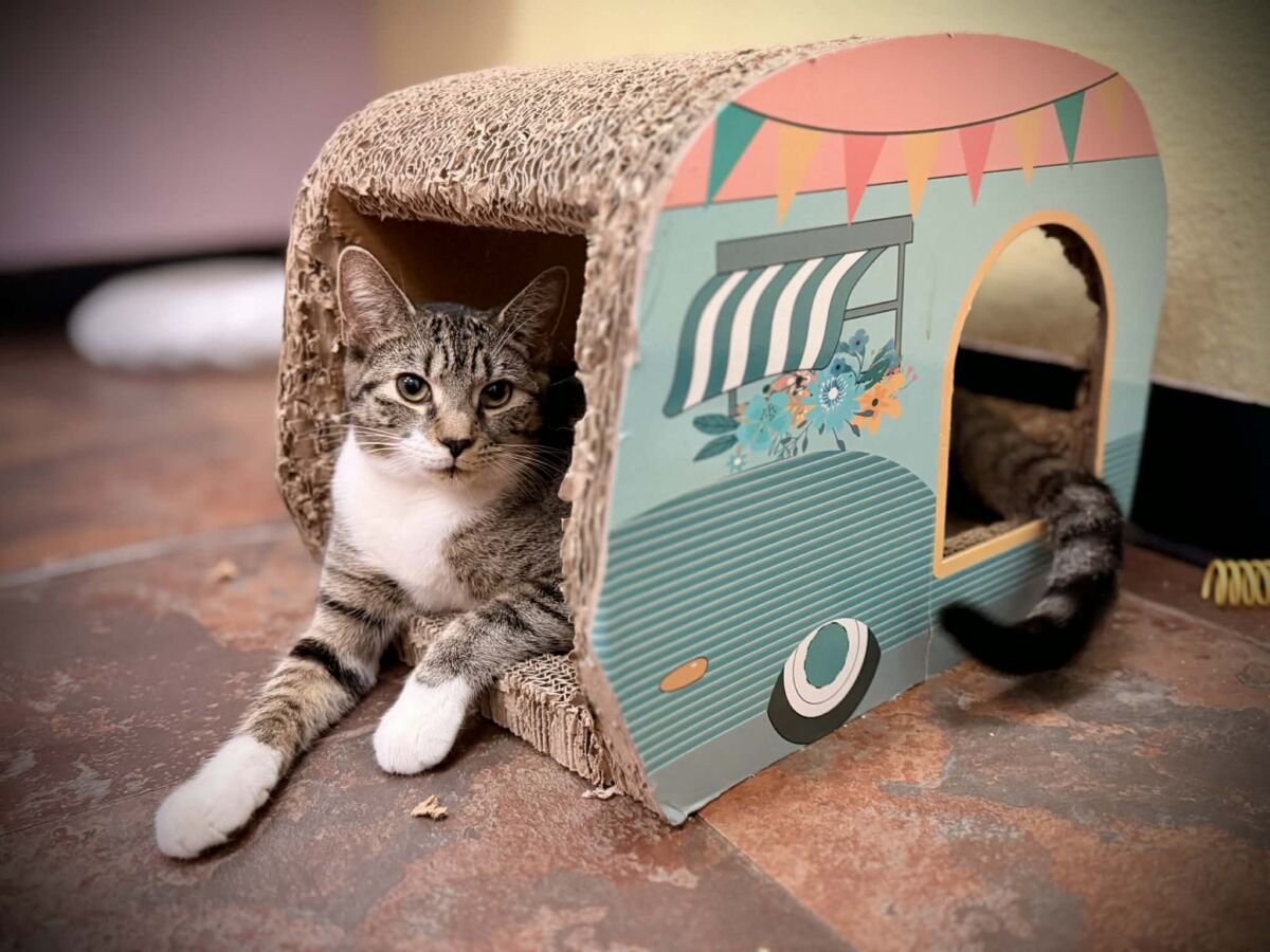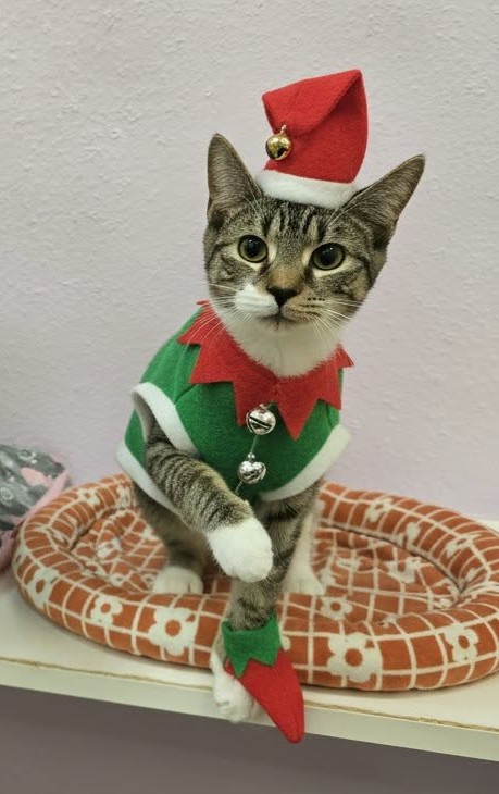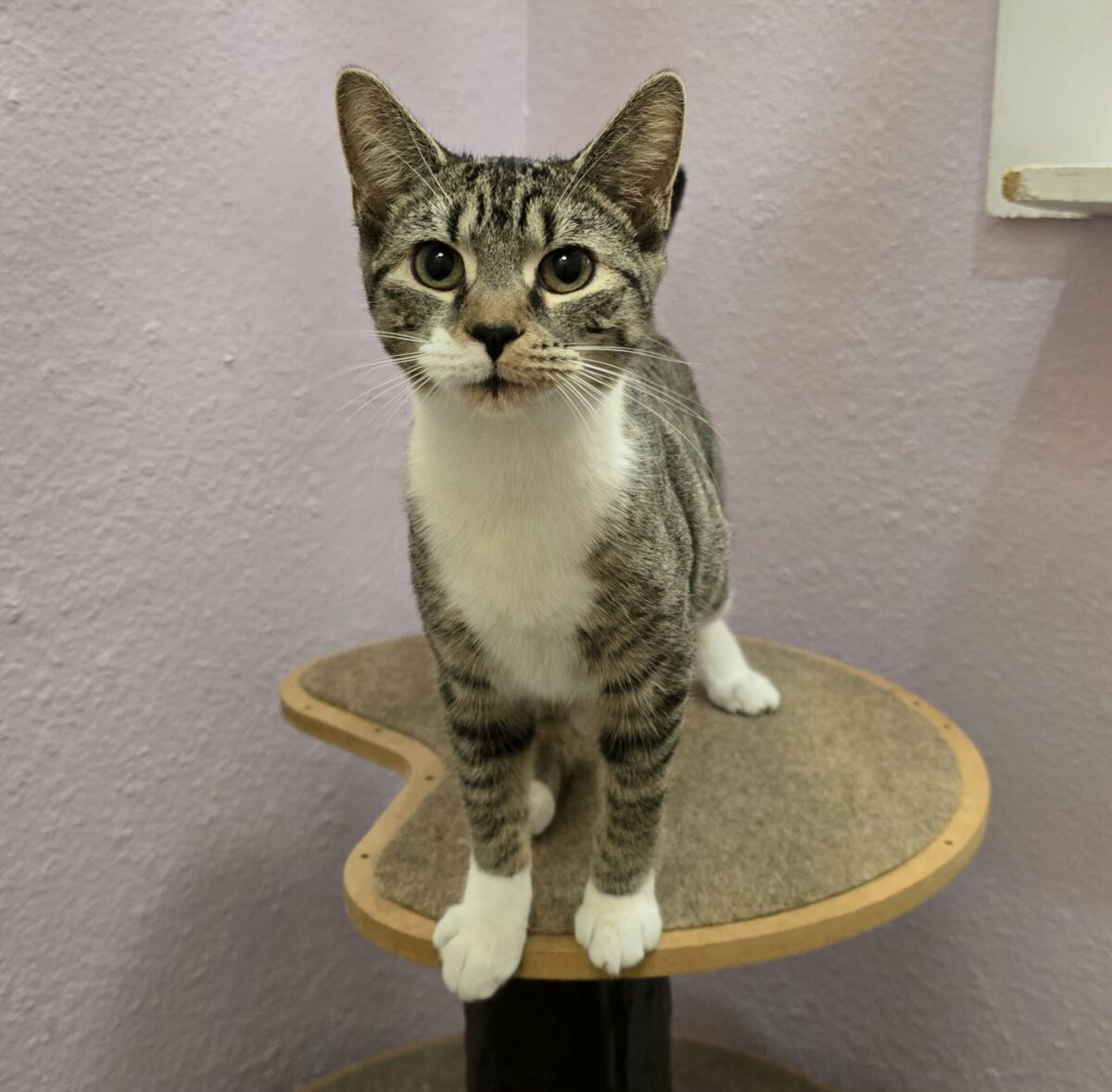 This little whirlwind of whiskers is Sagwa—a brown tabby beauty with a snowy white chest and the cutest white boots you’ve ever seen. She’s a mini explorer, always chasing shadows, pouncing on imaginary prey, and turning cardboard boxes into jungle gyms. Sagwa’s energy is contagious, her purrs are plentiful, and her cuddles? Top-tier. Whether she’s zooming across the room or curling up for a nap in a sunbeam, Sagwa brings joy wherever she goes. Ready to add a dash of mischief and a whole lot of love to your life? Sagwa’s waiting to meet you!