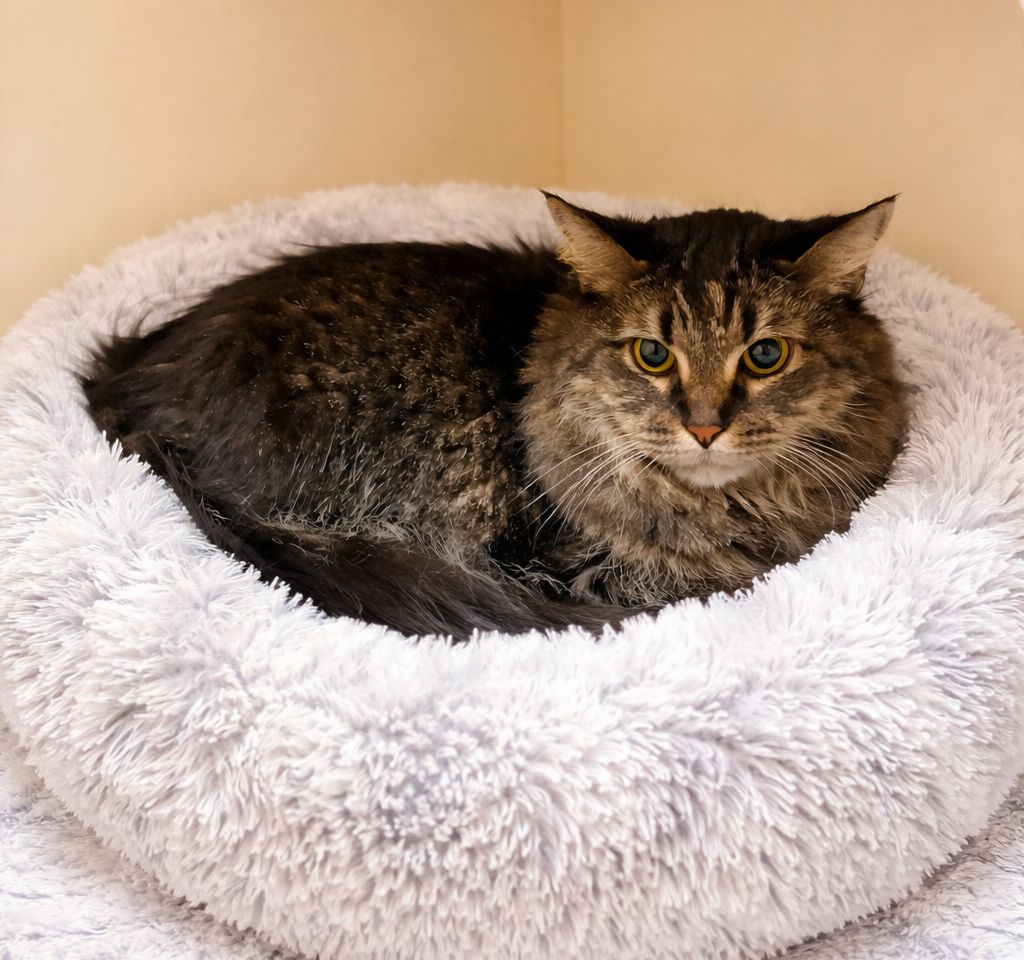 A lovely medium‑haired brown tabby with a gentle soul and a shy little heart. Sanity’s world shifted suddenly when her momma became ill, and now this sweet girl is looking for a soft landing of her own.