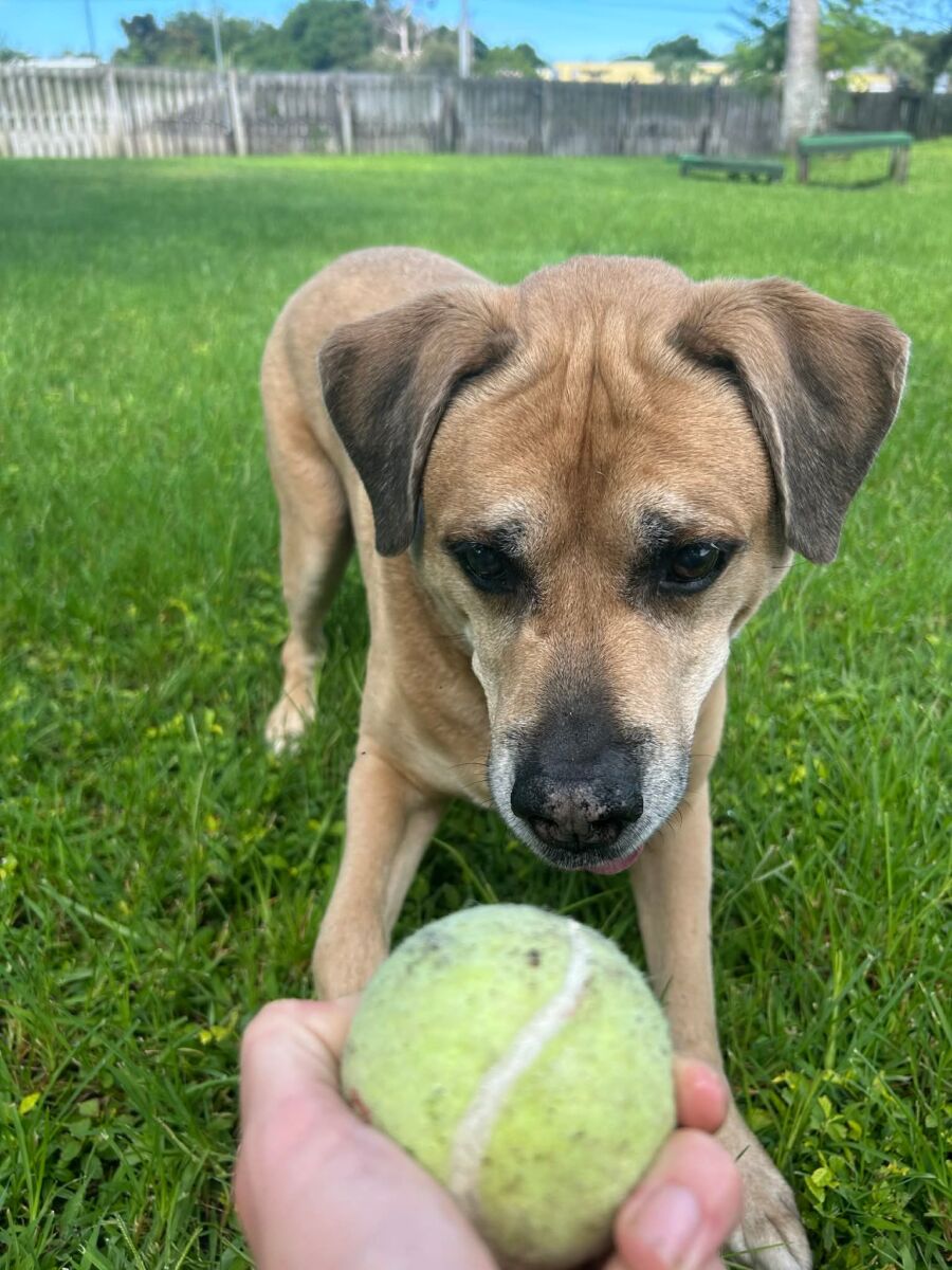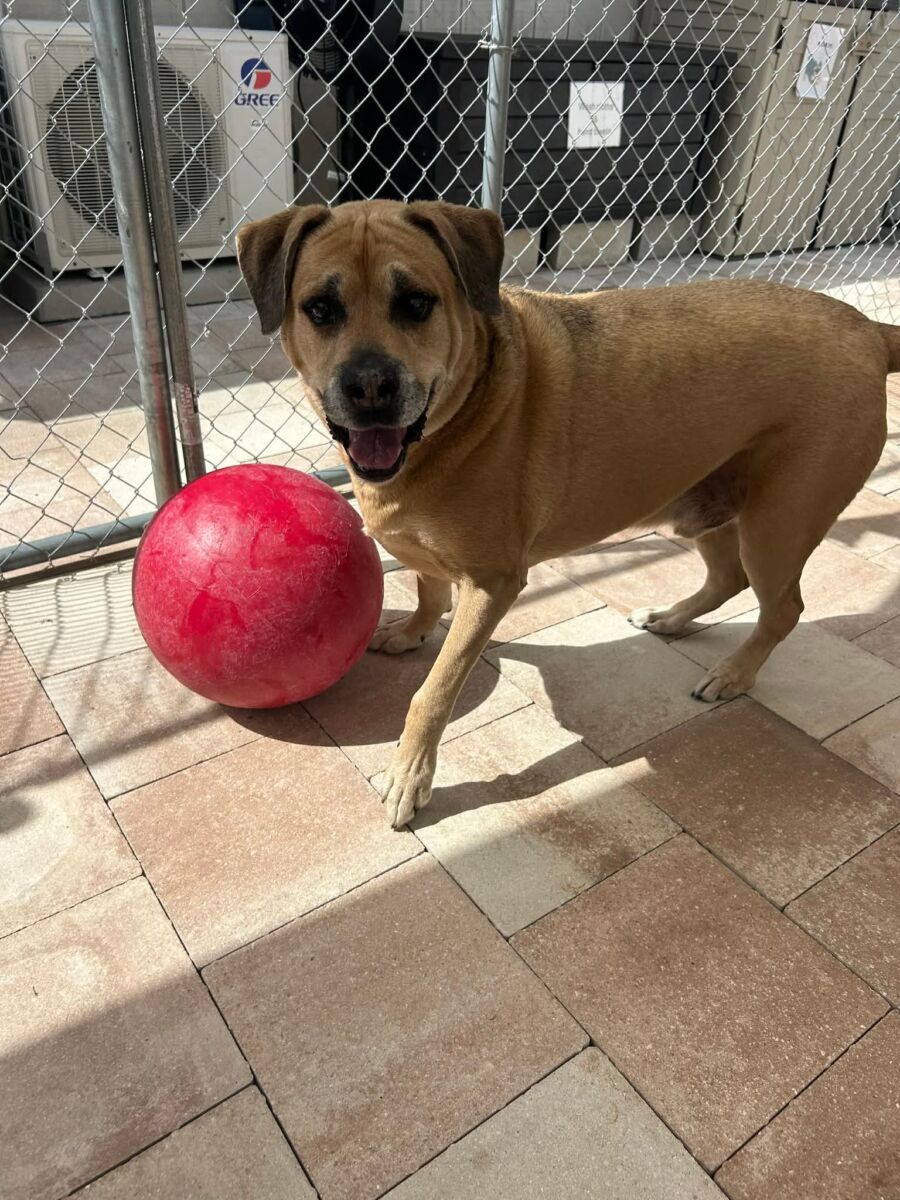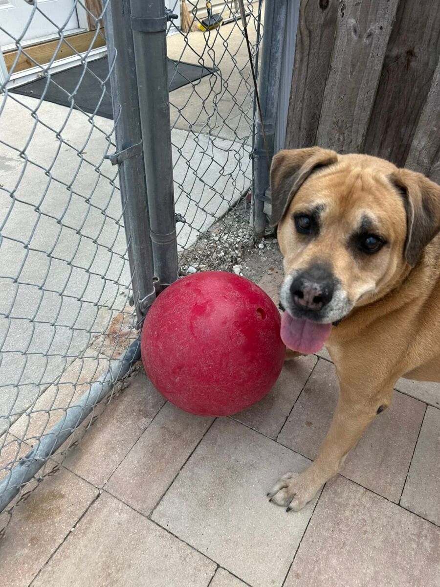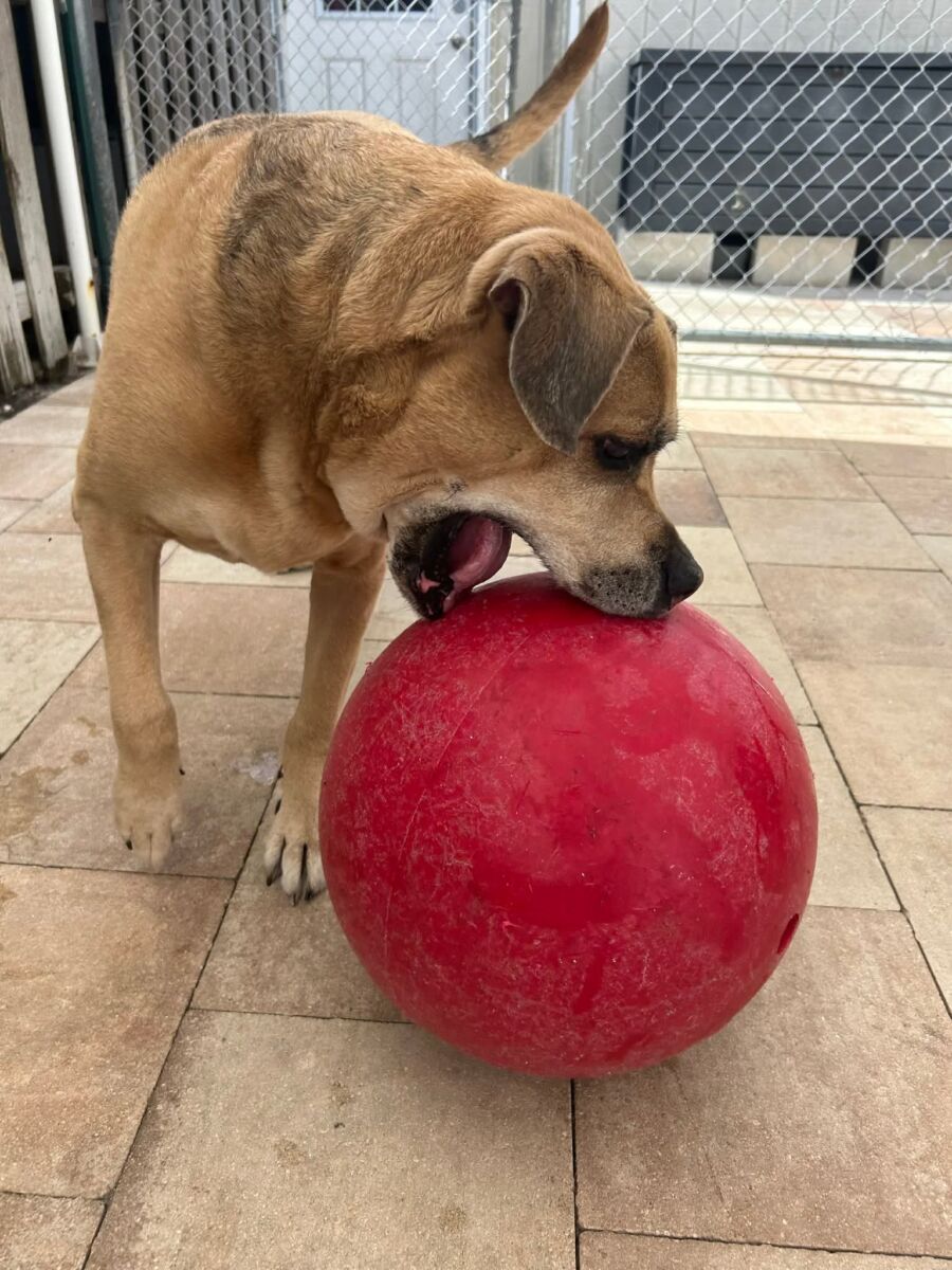 Kratos loves simple joys: carrying around his favorite orange Chuck It ball, playing tug-of-war, relaxing on beach days, enjoying tasty treats, and settling in for cozy naps. He’s hard of hearing and takes joint supplements to help manage his arthritis. He also gets occasional ear infections, but a quick round of antibiotics usually has him feeling better in no time.