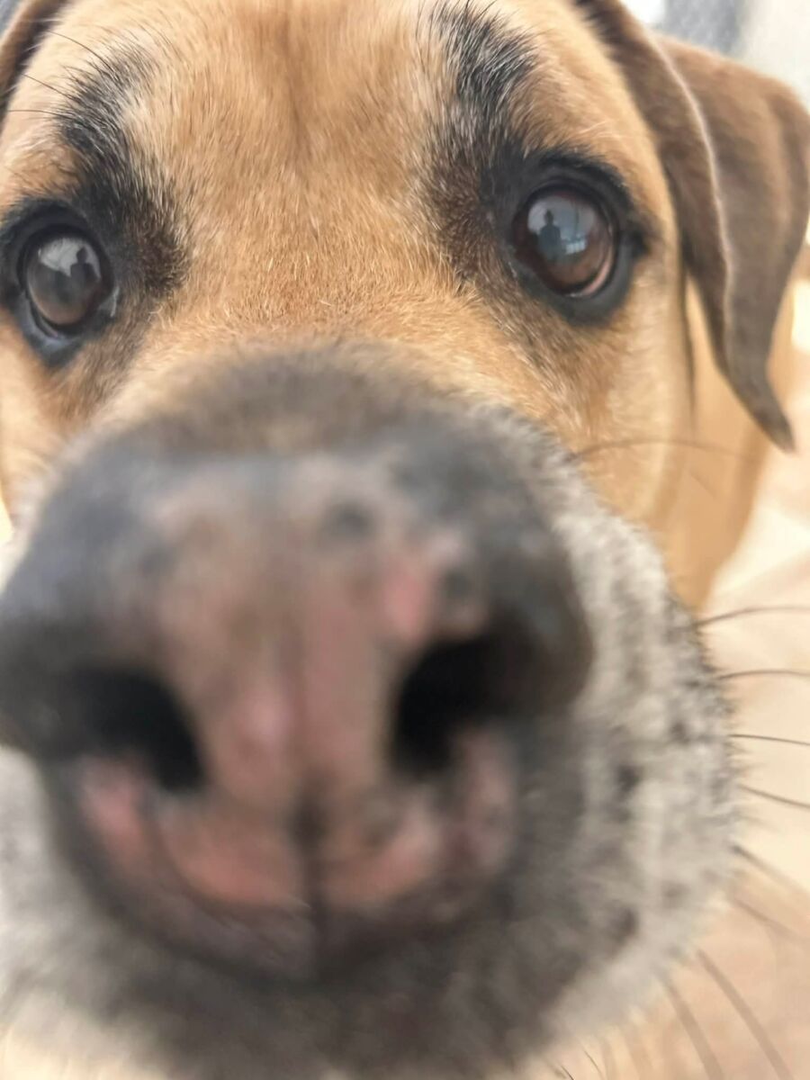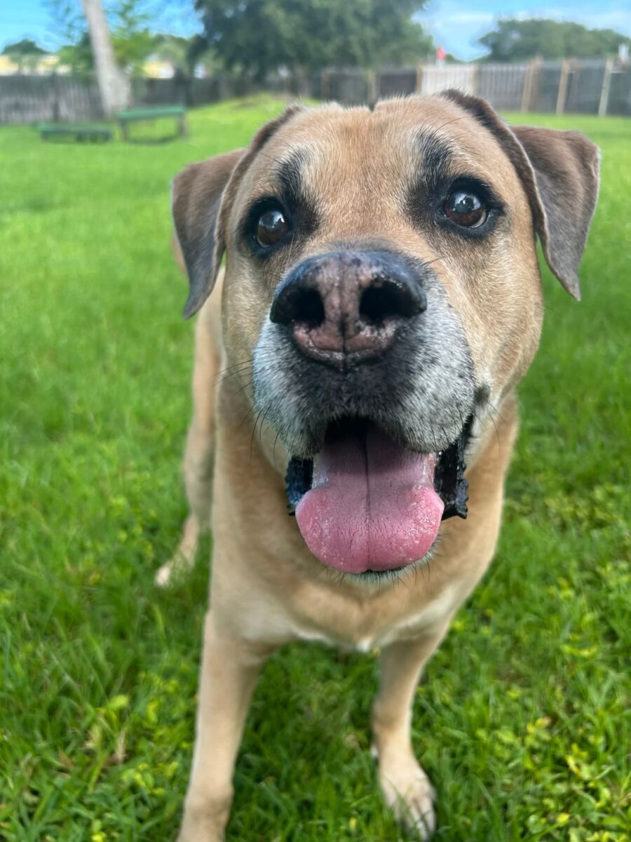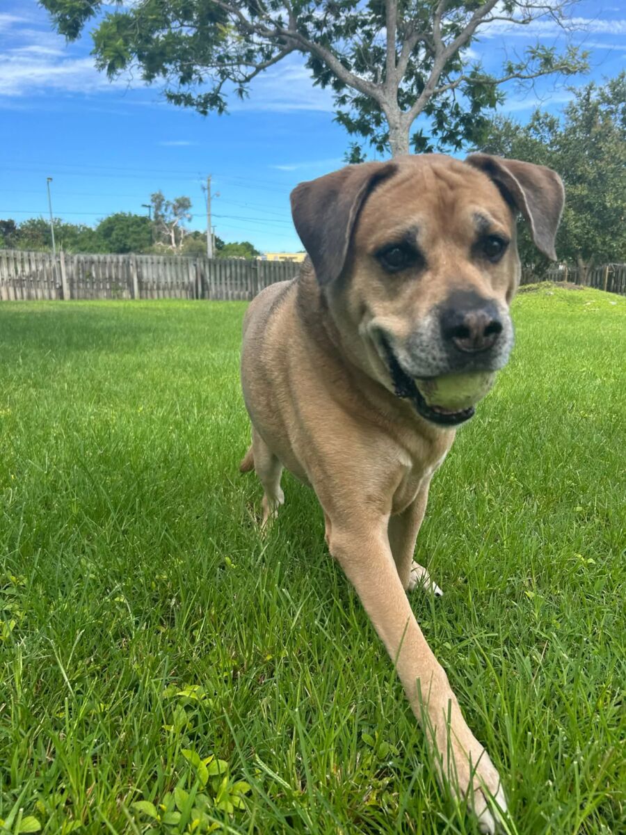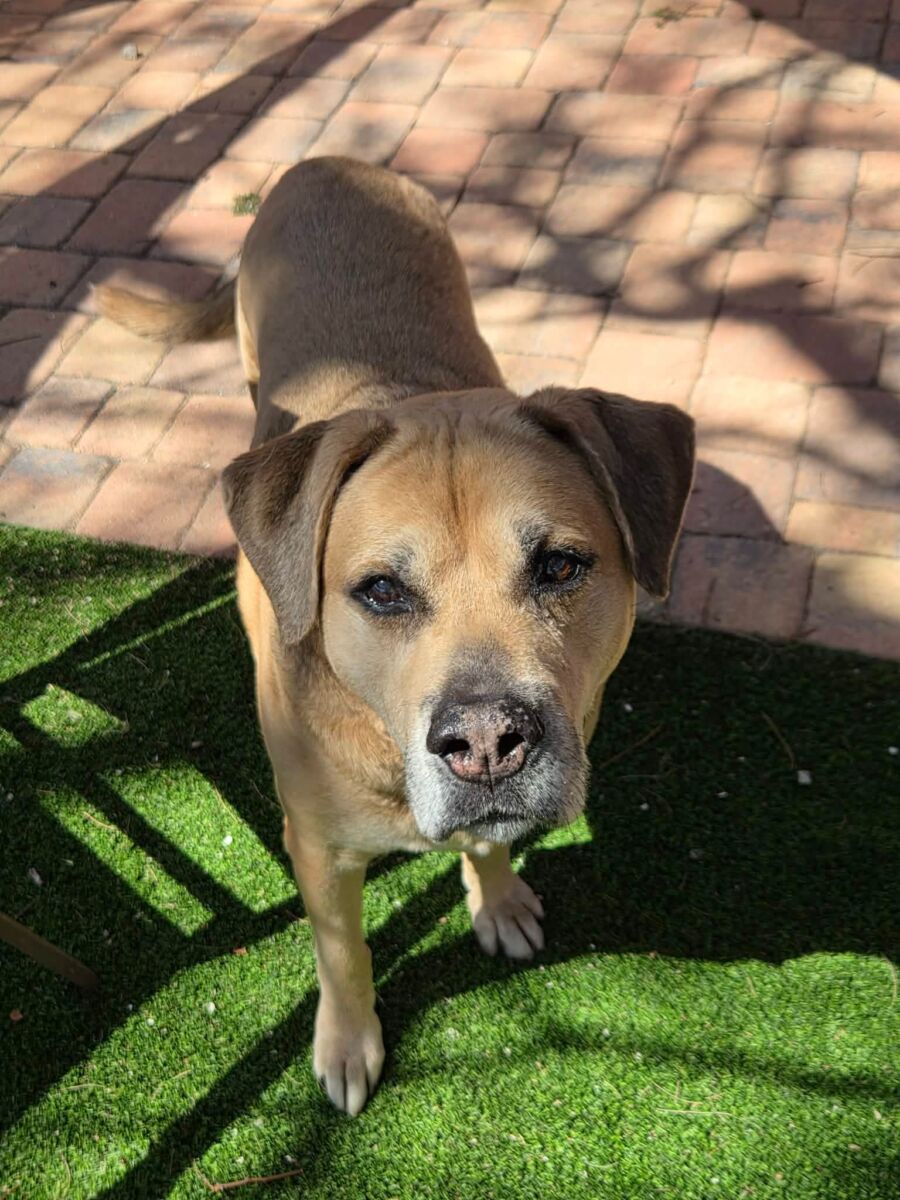 Kratos loves simple joys: carrying around his favorite orange Chuck It ball, playing tug-of-war, relaxing on beach days, enjoying tasty treats, and settling in for cozy naps. He’s hard of hearing and takes joint supplements to help manage his arthritis. He also gets occasional ear infections, but a quick round of antibiotics usually has him feeling better in no time.