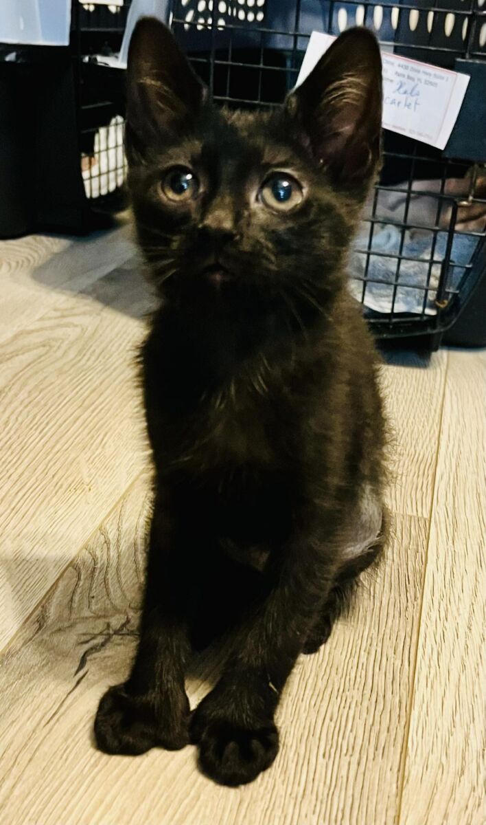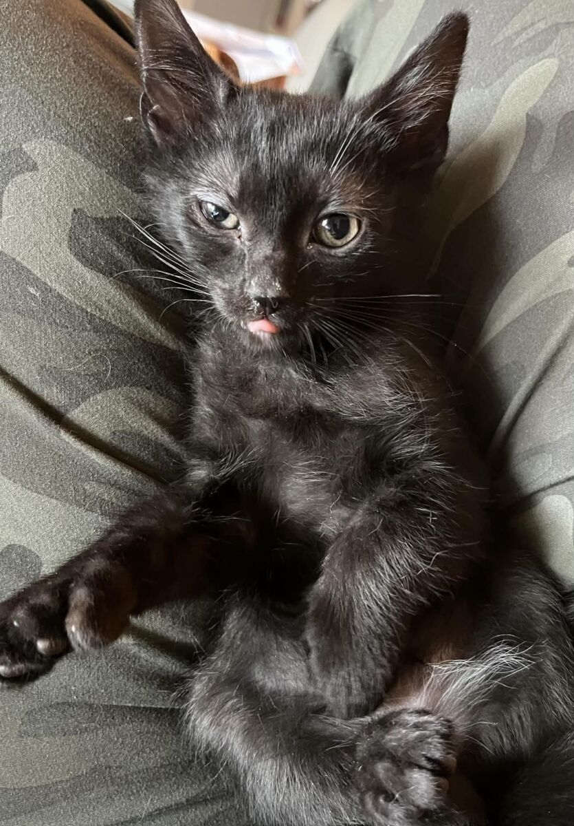 This little midnight floof may start off a bit shy, but give her a moment and she’ll show you her true passions: chasing anything that wiggles, swishes, or dangles, and diving face‑first into her beloved wet food. As one of the runts of her litter, she’s been learning—slowly but surely—that humans can be pretty wonderful.