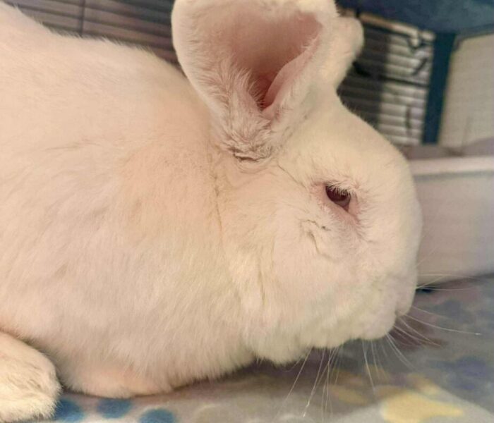 Elwood is a two-year-old New Zealand White rabbit with a snowy coat, soulful pink eyes, and a vibe thatâs pure chill. Weighing in at a solid 7 lbs of bunny bliss, heâs the kind of guy whoâs always down for a quiet hangout, a gentle head rub, or a cozy nap in a sunbeam.